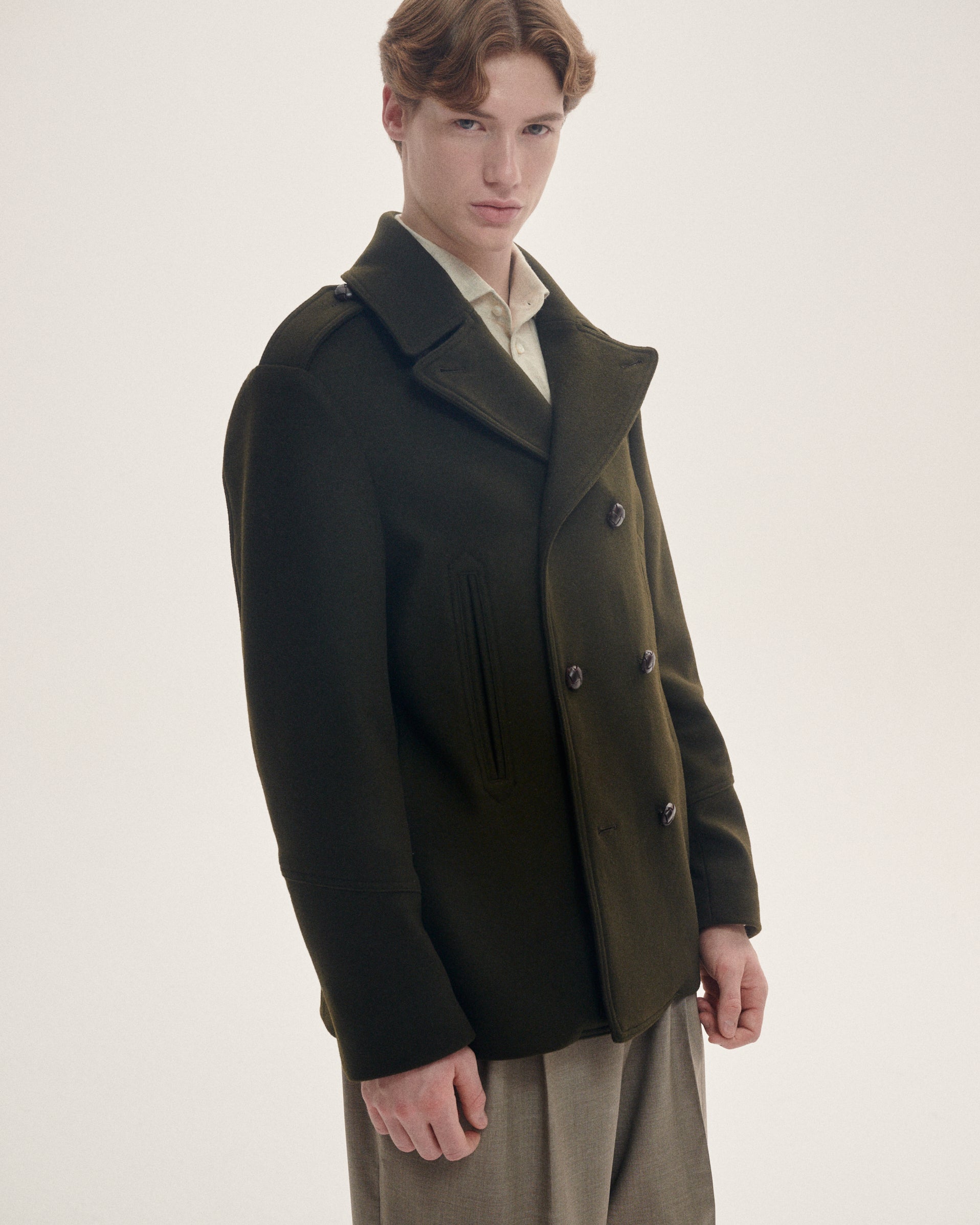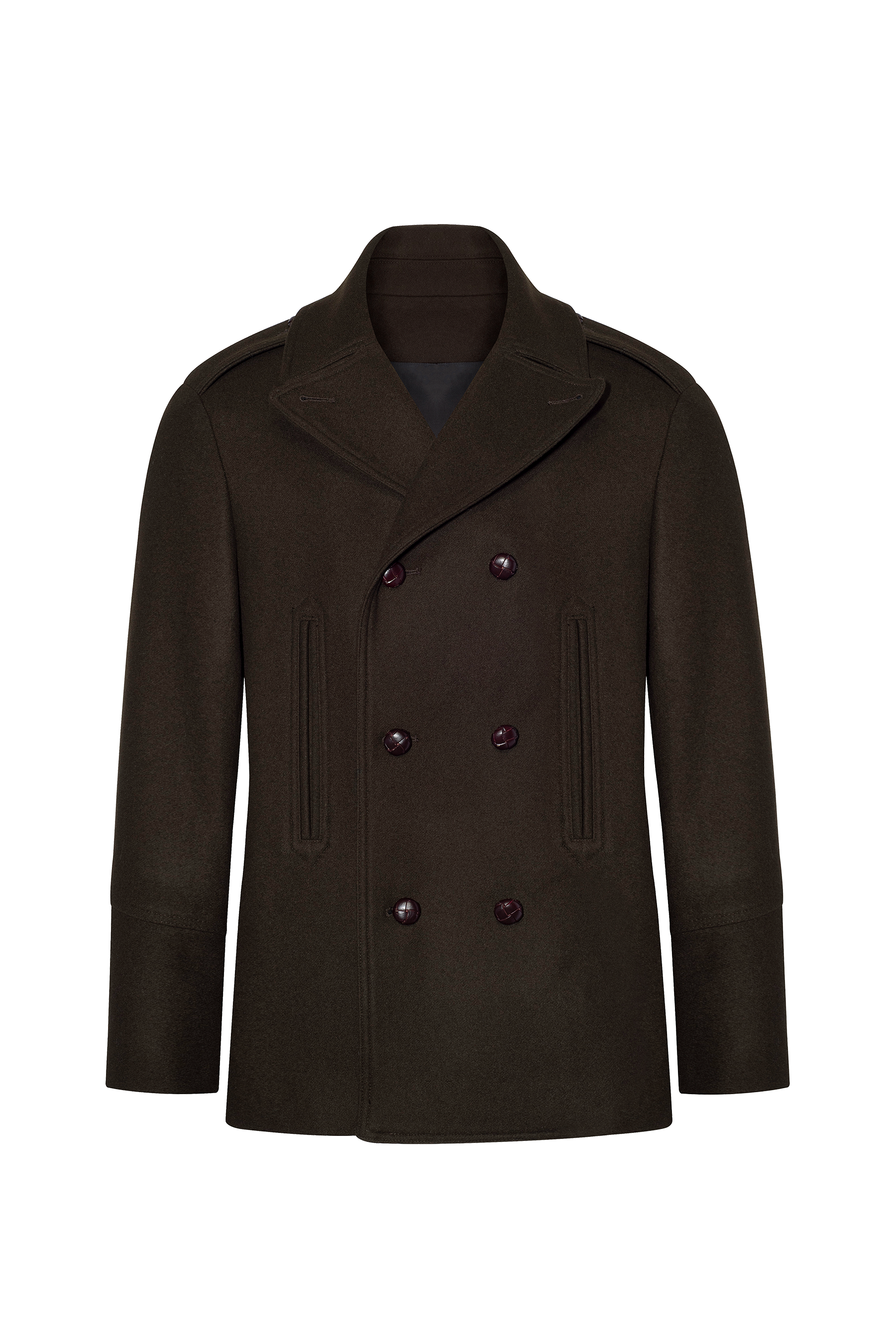Ta dwurzędowa kurtka typu Pea Coat, inspirowana mundurem Royal Navy, została uszyta z najwyższej jakości wełny Loro Piana w głębokim oliwkowo-brązowym odcieniu. Klasyczna forma inspirowana marynarskim stylem zyskała wyrafinowany charakter dzięki szerokim klapom, pagonom na ramionach i dopracowanym detalom krawieckim. Skórzane guziki oraz boczne kieszenie podkreślają jej elegancki, a zarazem funkcjonalny charakter.