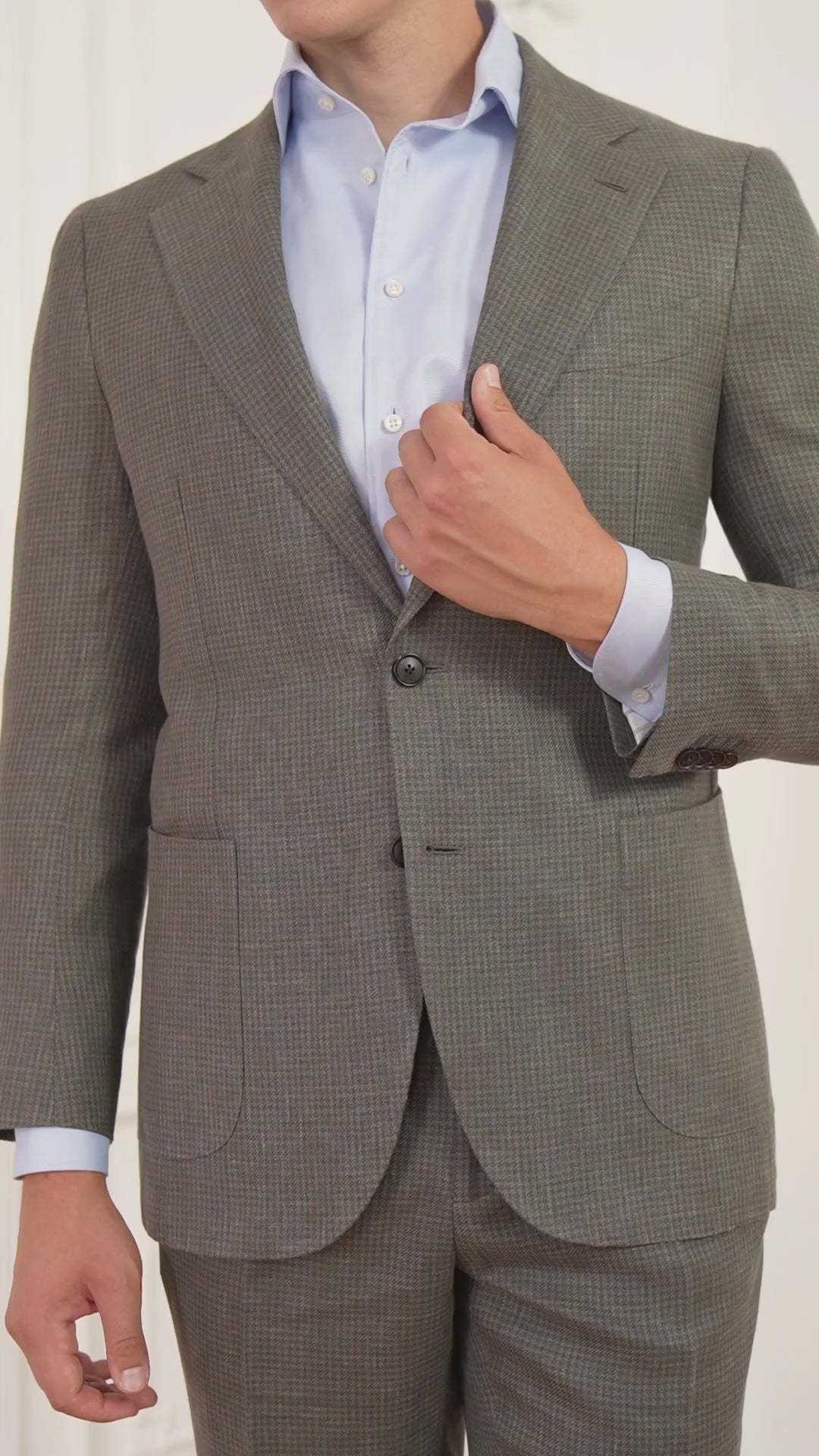 Garnitur w subtelny wzór hounds-tooth w zielonym kolorze to uniwersalna propozycja, od której warto rozpocząć budowanie przemyślanej garderoby kapsułowej. Klasyczny wzór nadaje mu ponadczasowego charakteru, a ciepła kolorystyka sprawia, że doskonale sprawdzi się zarówno w stylizacjach biznesowych, jak i mniej formalnych.