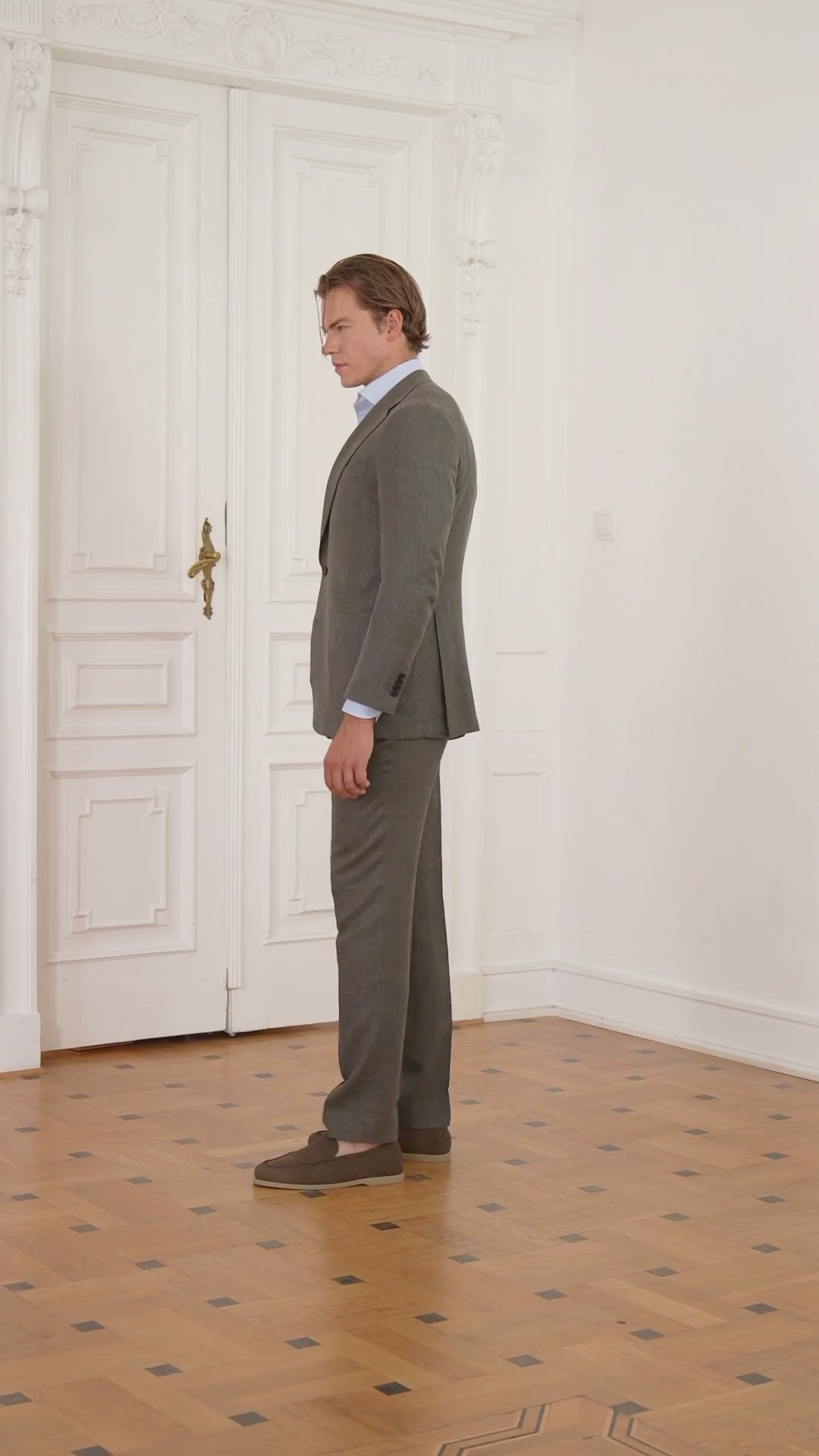 Szerokie klapy i delikatnie wyprofilowana brustasza typu barchetta podkreślają krawiecki charakter projektu. Lekka konstrukcja z miękkim wkładem nośnym oraz brak wypełnień w ramionach gwarantują wygodę i swobodę ruchu przez cały dzień. Marynarka świetnie prezentuje się także w zestawieniu z innymi spodniami – zarówno gładkimi, jak i o wyraźniejszej fakturze – co czyni ją wyjątkowo funkcjonalnym elementem garderoby.
