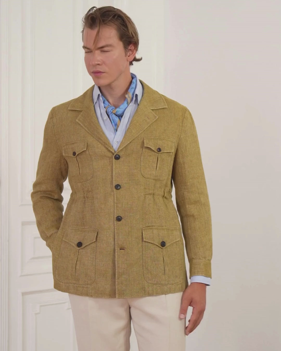 Ta kurtka safari z miękkiego spranego lnu, charakteryzuje się ponadczasowym stylem. Konstrukcja bez podszewki, z centralnym zapięciem na rogowe guziki i kieszenie w stylu Safari, Doskonale sprawdzi się w wiosenno-letnich stylizacjach mężczyzny, który lubi dbać o swoją garderobę.