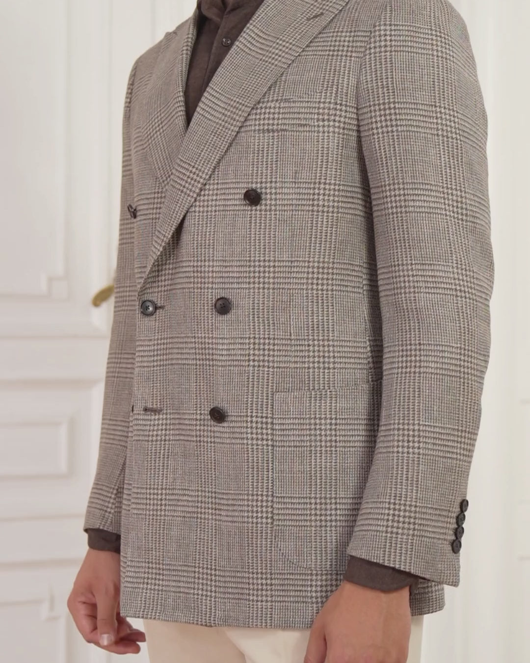 Marynarka dwurzędowa w beżowo-czekoladową kratę, to świetna całoroczna propozycja, Uszyta z pięknej niesamowicie miękkiej wełny. Zdjęcia nie są w stanie oddać wyjątkowości tej tkaniny.