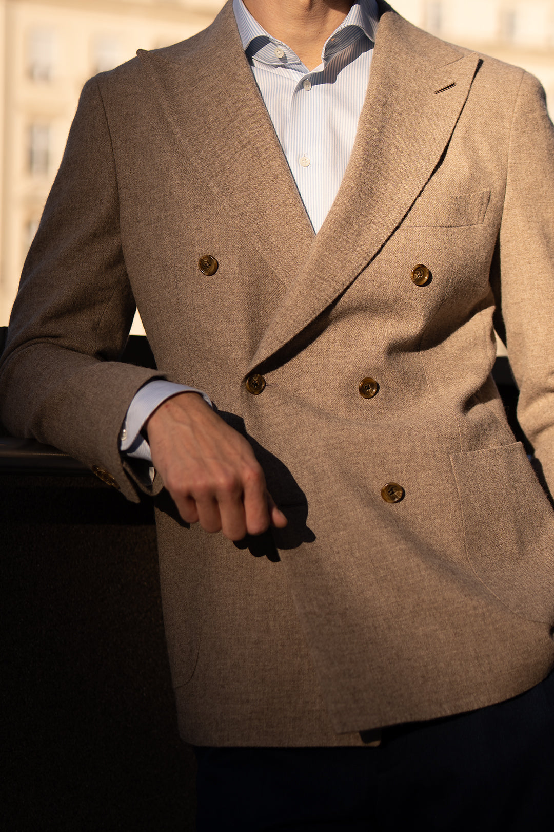 Marynarka dwurzędowa z beżowej flaneli to elegancka propozycja na sezon jesienno-zimowy i świetna alternatywa dla klasycznego granatowego garnituru. Uszyta z wysokiej jakości wełny, jest lekka, wygodna i niezwykle uniwersalna. Konstrukcji bez wypełnień w ramionach zapewnia naturalny komfort, a szerokie klapy i barchetta nadają jej włoskiego charakteru. To marynarka męska, która sprawdzi się zarówno w zestawie garniturowym, jak i w połączeniu z innymi spodniami.